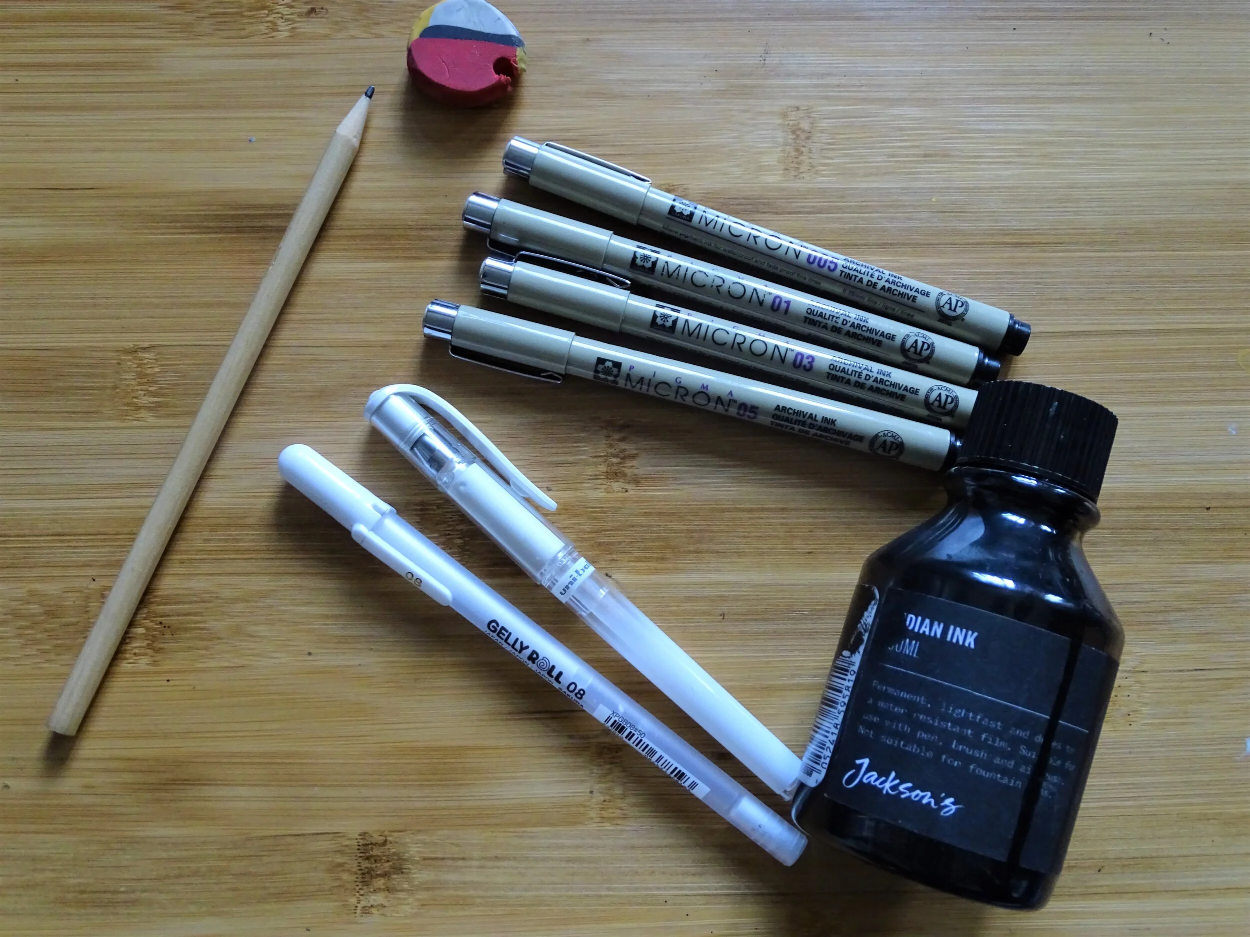 I’m going to be painfully predictable here and mention some of the most famous and cult pens on the planet: Sakura Microns. I use the black ones, and mostly I’ve been reaching for 005, 01, 03 and 05. There isn’t much to say about these: they dry really quickly, they deliver really clean, satisfying lines, the ink lasts for quite a while (obviously this depends on how often you use them) and they mostly work well with other mediums. I’m not completely loyal to a particular brand when it comes to liners, mostly because I always want to keep trying new discoveries, but these are a favourite I know I can always rely on and come back to.